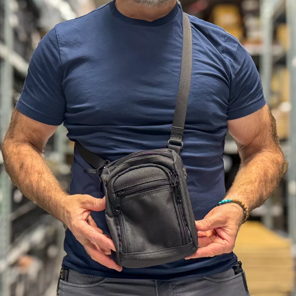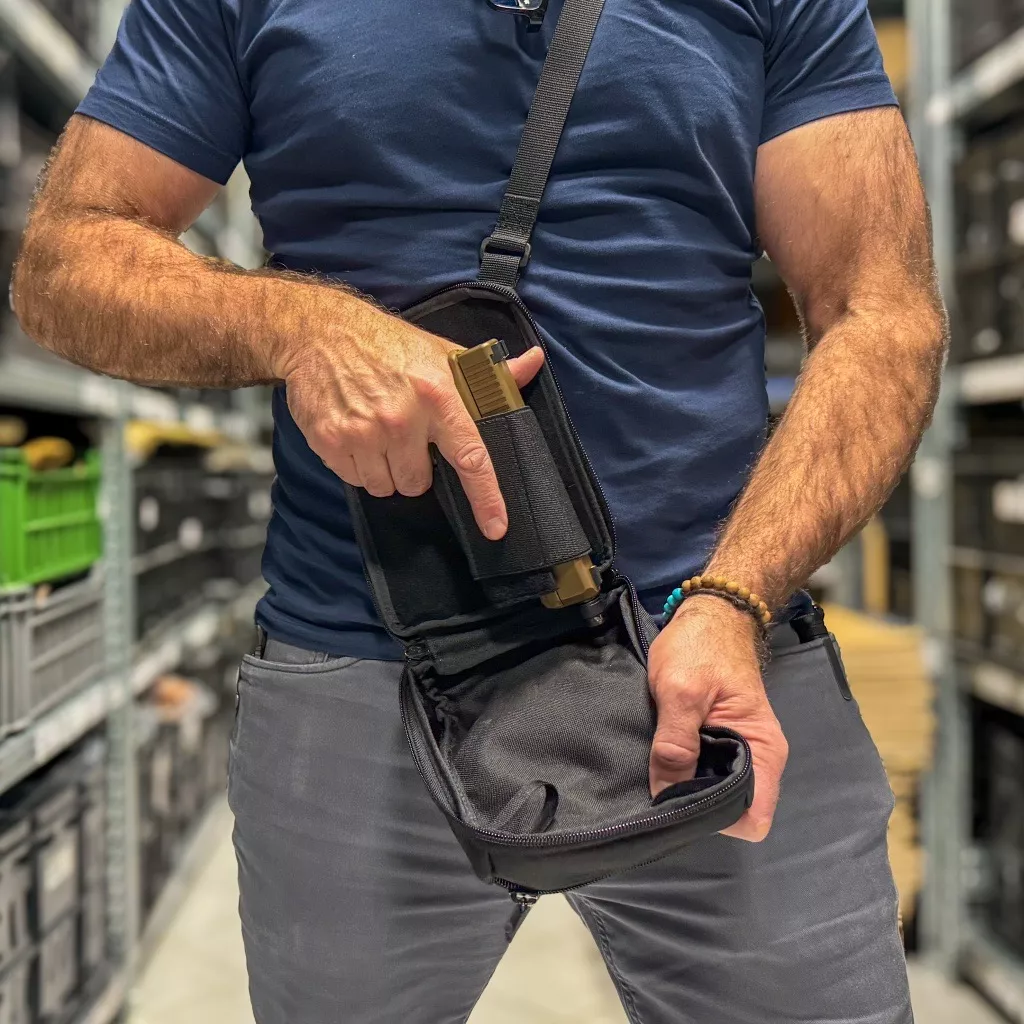 Malá, ale šikovná taška pro skryté nošení. Zbraň je umístěna v oddělení při těle. Otevření a následné tasení pomocí vytržení zipů. Pro zachování stability při pohybu je možné tašku upnout za opasek poutkem na zadní straně. Na přední straně jsou přepážky na peněženku, klíče, doklady. Vhodná pro praváka i leváka.