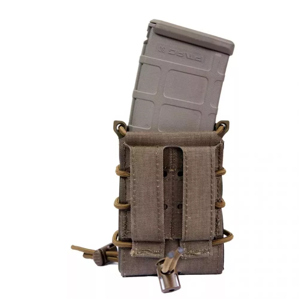 Univerzální samosvorná sumka s laserem řezaným MOLLE systémem. Tvar sumky udržuje postranní polymerový rám. Díky důmyslnému systému svoru pojme sumka většinu puškových zásobníků včetně zásobníků pro AR, AK i SA58. Pouzdro zajišťuje zásobník samosvorem, takže není potřeba žádná další pojistka, jako krycí chlopeň, nebo zajišťující šňůrka. Laserem řezaná Molle vazba poskytuje nižší profil sumky a elegantní vzhled.
