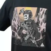 Tričko s kostrou ve vojenském stylu se zničeným městem v pozadí.