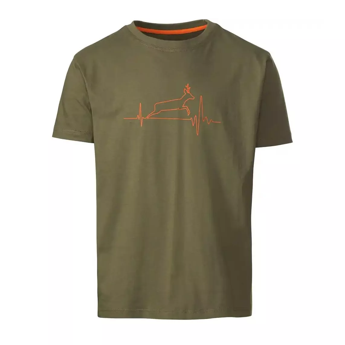 Pohodlné tričko s inovativním loveckým potiskem. Křivka EKG v signální oranžové barvě ukazuje srdeční tep při míření na srnce.