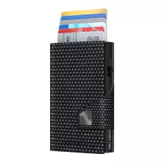 5 karet k dispozici pouhým stisknutím tlačítka (pro správné fungování otvíracího mechanismu je potřeba peněženku naplnit 5 kartami). Samostatné otvírání sekce na bankovky a vizitky, kam lze v případě potřeby uložit dalších 7 karet. Vyrobeno v Německu.