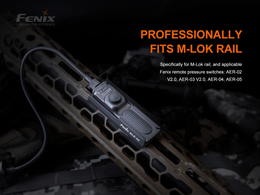 Úchyt Fenix ALG-06 lze použít pro upevnění koncovky kabelového spínače na rozhraní M-LOK (Magpul Lock). Kompatibilní s kabelovými spínači Fenix AER-02, Fenix AER-02 V2.0, Fenix AER-03, Fenix AER-03 V2.0, Fenix AER-04 a Fenix AER-05.